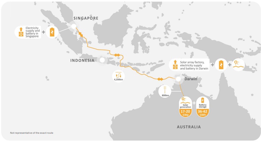 Le projet intégrera une gamme de technologies et d’infrastructures, y compris l’une des plus grandes fermes solaires au monde qui sera située dans le Territoire du Nord, en Australie, avec une capacité allant jusqu’à 20 GWc, la plus grande batterie au monde avec jusqu’à 42 GWh, et le le plus long système de câbles sous-marins à courant continu haute tension (HVDC) avec une longueur de 4 200 km de Darwin à Singapour.