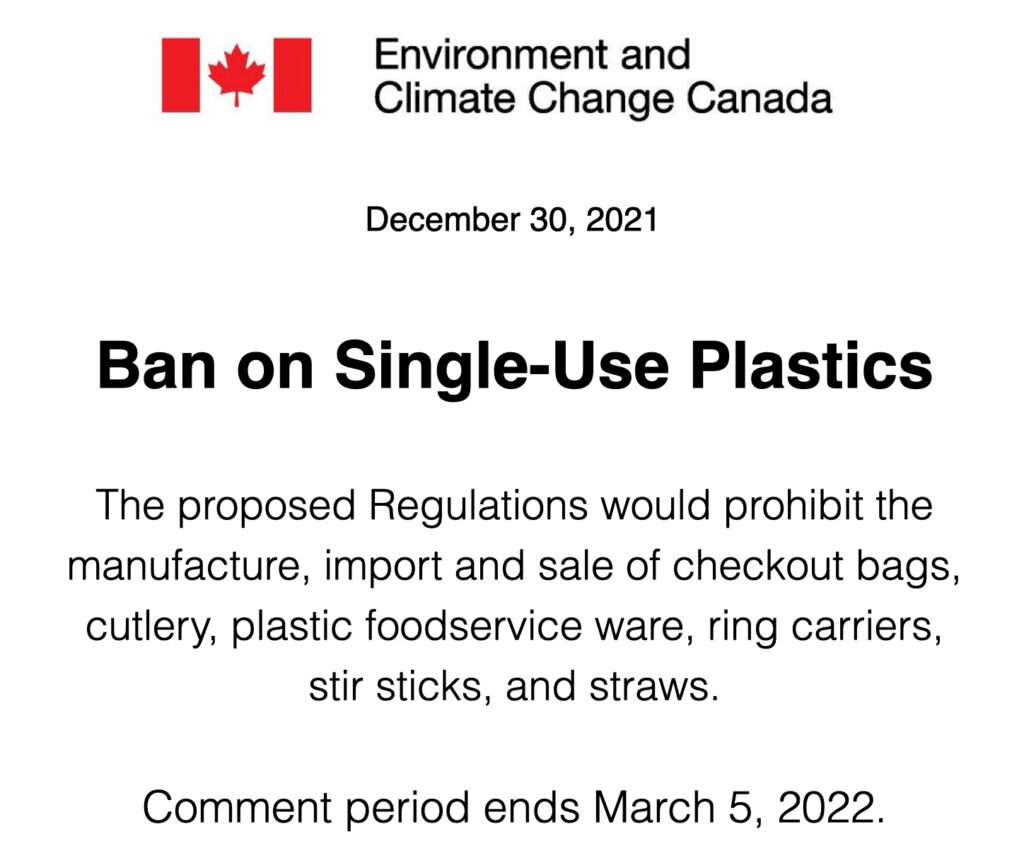 Le 25 décembre 2021, la proposition Règlement sur l’interdiction des plastiques à usage unique ont été publiés dans le Gazette du Canada, Partie I amorçant une période de commentaires du public de 70 jours se terminant le 5 mars 2022. Au cours de cette période, les intervenants et les partenaires sont invités à soumettre des commentaires à Environnement et Changement climatique Canada sur le projet de règlement, le Résumé de l’étude d’impact de la réglementation qui l’accompagne, ainsi que comme le projet d’orientation pour la sélection d’alternatives.