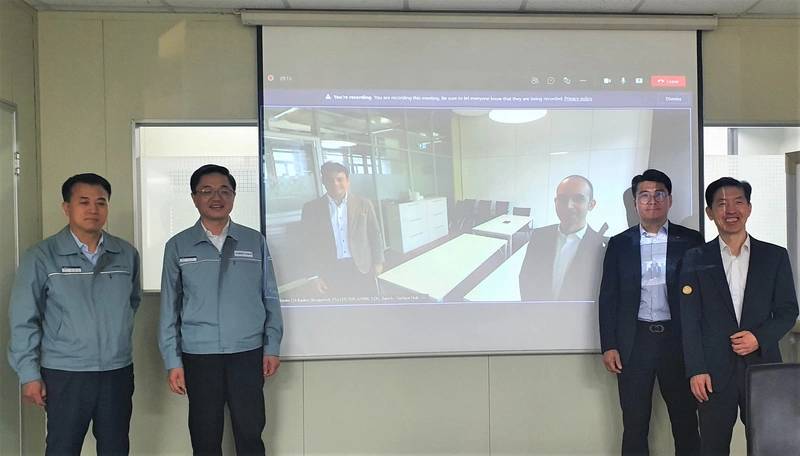 Young-Gi Kim, directeur général de l’équipe stratégique d’entreprise, HSD et Sang-Min Lee, directeur général principal de l’équipe stratégique d’entreprise, HSD ; Young-Ki Lee, Tekomar Global Sales Manager, ABB Turbo Charging et Jae-Ung Park, Country Manager, ABB Turbo Charging Sur l’écran de gauche à droite : Cristian Corotto, SVP Digital Customer Solution, ABB Turbo Charging et Mauro De Micheli, Head of Sales, Marketing and Partenariats Solutions numériques, ABB Turbocharge. Photo gracieuseté de la turbocompression ABB