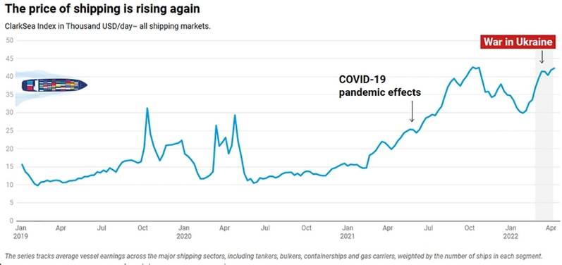 Les prix des céréales et les frais d’expédition sont en hausse depuis 2020, mais la guerre en Ukraine a exacerbé cette tendance et inversé une baisse temporaire des prix d’expédition.