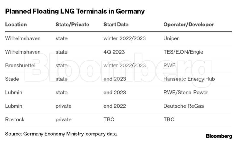 L’Allemagne s’est précipitée pour construire des infrastructures pour importer plus de GNL et réduire sa dépendance au gazoduc russe dans un contexte de crise énergétique sans précédent. Le gouvernement a adopté une loi pour accélérer les délais d’approbation des projets et a dépensé des milliards pour affréter des installations d’importation. Les entreprises se sont entendues avec Berlin pour organiser des approvisionnements temporaires qui passeront par les nouveaux terminaux.