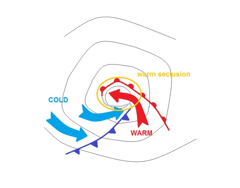 Les événements de vent de force ouragan se produisent principalement pendant la période d’isolement chaud ou de maturité du cycle de vie du cyclone extratropical, tel que décrit par Shapiro & Keyser dans un journal en 1990(2). Au cours de cette étape, il peut y avoir une caractéristique semblable à un œil de vent relativement calme et de ciel clair.