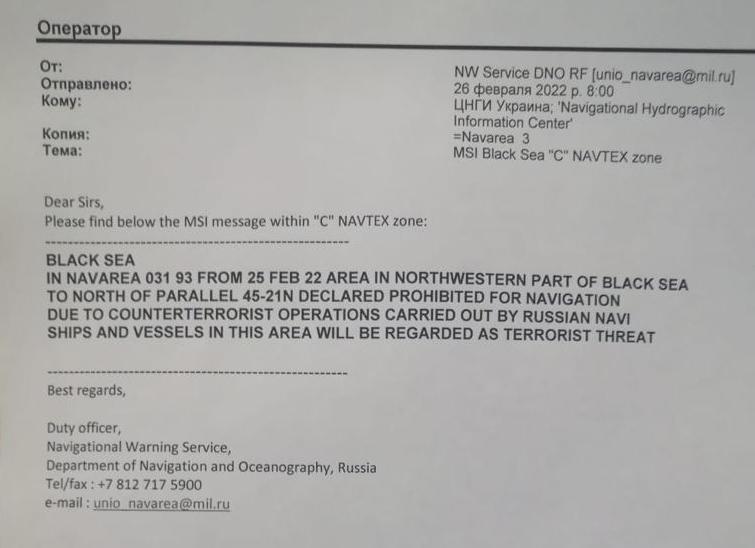Selon plusieurs sources et un message NAVTEX qui aurait été émis par la Russie, la marine russe a déjà commencé à effectuer des « opérations antiterroristes » contre la navigation au-delà de l’Ukraine. Selon un rapport de Dryad, trois navires ont été détenus par la marine russe et un quatrième navire a subi de légers dommages, bien que l’on ne sache pas comment et quand ces dommages ont été subis.