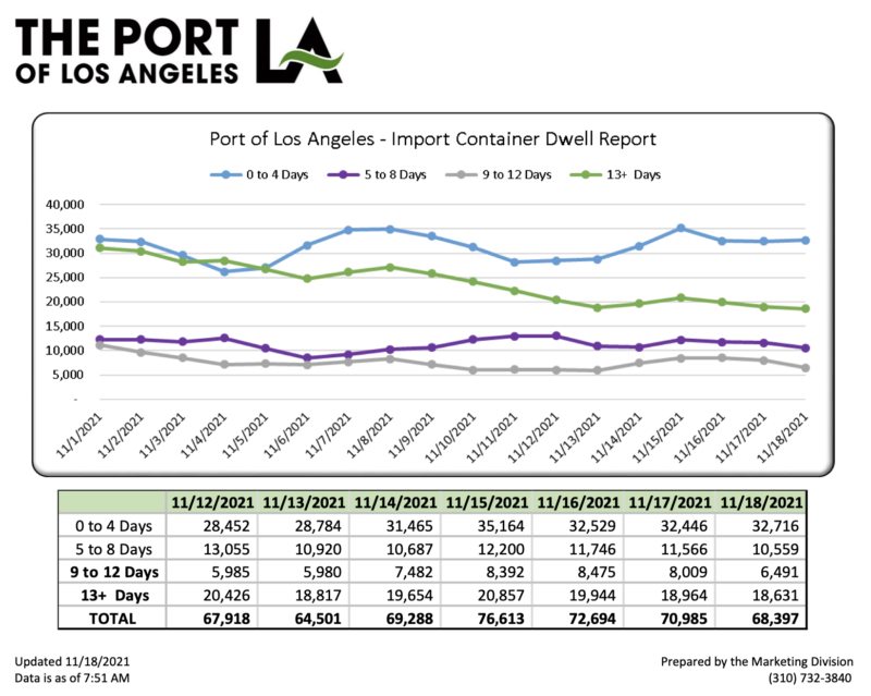 L’annonce du port a mis en évidence une baisse de 31% – de 94 981 à 65 080 – du nombre de conteneurs d’importation sur les terminaux maritimes du port de Los Angeles depuis le 24 octobre, la veille du jour où les ports de Los Angeles et Long Beach ont annoncé des amendes pour les conteneurs d’importation de neuf jours ou plus. Les conteneurs d’importation de plus de 9 jours ont diminué de 35%, passant de 37 410 à 24 361, a indiqué le port.