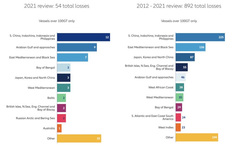 L’étude annuelle de l’AGCS analyse les pertes de navires et les pertes (incidents) de plus de 100 tonnes brutes. En 2021, 54 pertes totales de navires ont été signalées dans le monde, contre 65 un an plus tôt. Cela représente une baisse de 57 % sur 10 ans (127 en 2012), alors qu’au début des années 1990, la flotte mondiale perdait plus de 200 navires par an.