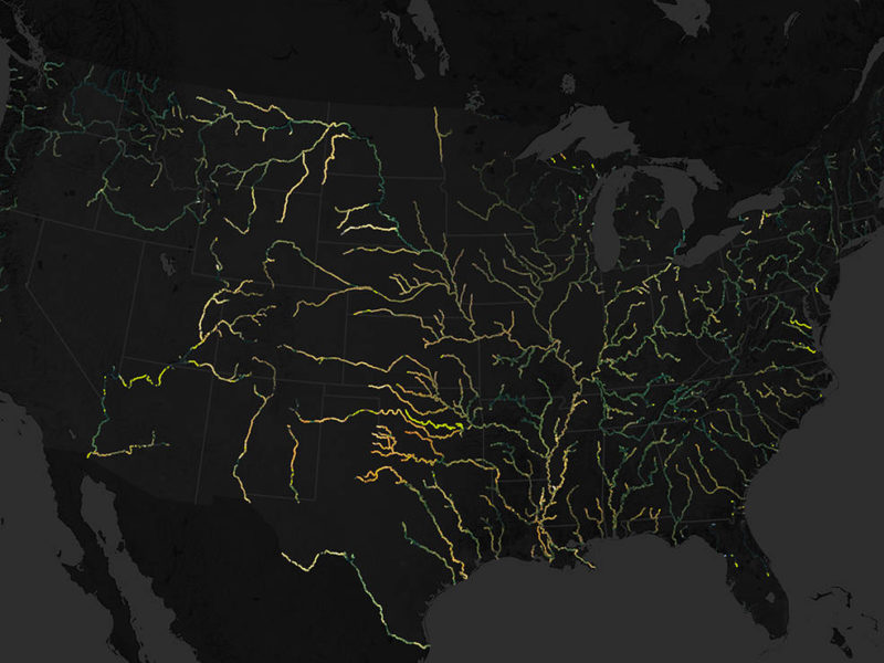 La figure ci-dessus montre les données d’une carte de couleur de rivière pour les États-Unis contigus. Les rivières sont colorées comme elles apparaîtraient approximativement à l’œil humain. La carte a été construite à partir de 234 727 images collectées par les satellites Landsat entre 1984 et 2018. L’ensemble de données comprend 67 000 miles (100 000 kilomètres) de voies navigables d’au moins 200 pieds (60 mètres) de large.
