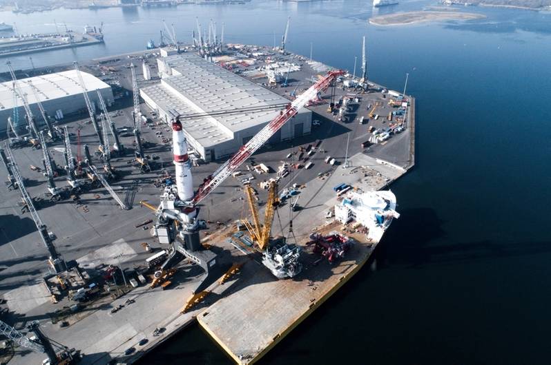Crédits: Liebherr «Le levage en tandem des deux gros composants a été réalisé sur le site Liebherr de Rostock en utilisant deux représentants puissants du genre: la grue sur chenilles LR 11350 et le TCC 78000, prouvant une fois de plus l’importance de ce puissant portique sur rails. grue », a déclaré la société, ajoutant qu’en raison des ascenseurs se déroulant directement sur le quai, le navire de transport a pu commencer son voyage en empruntant la route la plus courte vers la mer Baltique.