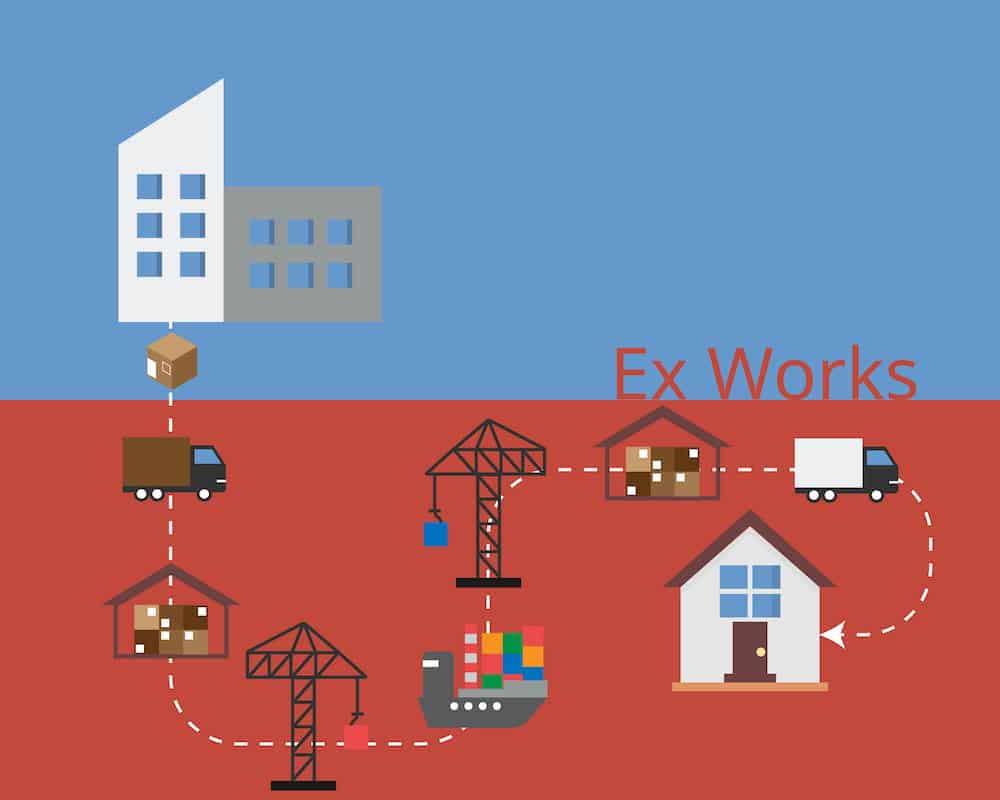 Ex-Works signifie la livraison à l’entrepôt ou aux locaux de l’usine du vendeur, à l’entrepôt d’un transitaire ou à l’entrepôt du transporteur maritime qui transporterait la cargaison par mer jusqu’à sa destination finale telle que spécifiée par l’acheteur.