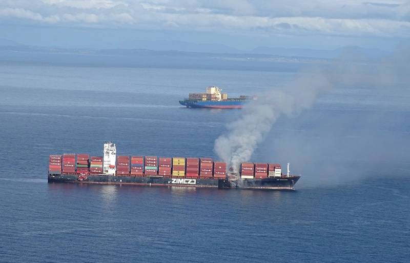 Seize membres d’équipage ont été évacués du MV Zim Kingston samedi, tandis que cinq sont restés à bord pour combattre l’incendie.
