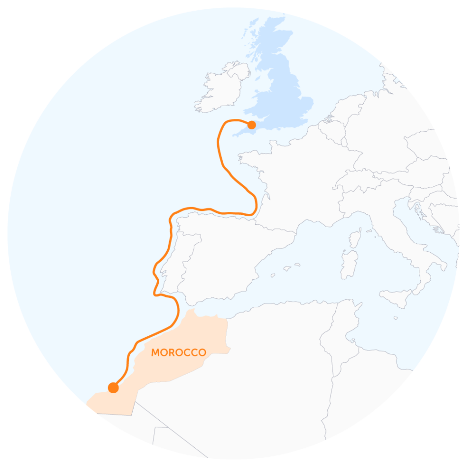 Quatre câbles, chacun de 3 800 kilomètres de long, forment les systèmes de câbles sous-marins jumeaux HVDC de 1,8 GW qui suivront la route en eau peu profonde du site marocain à un emplacement du réseau en Grande-Bretagne, en passant par l’Espagne, le Portugal et la France.